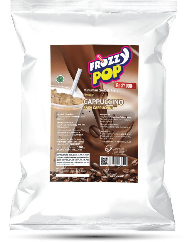 Frozzy Pop adalah minuman serbuk dengan berbagai rasa. Tersedia dalam kemasan Bulky 500 gr dan sudah mengandung gula.